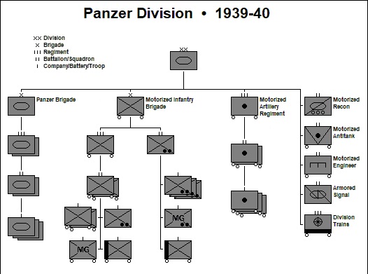[40] L’organizzazione del Pz-D durante la campagna occidentale fu solo transitoria e il concetto stesso di Panzer-Division si sarebbe evoluto rapidamente e profondamente. Dalla fine del 1940 e in vista dell’invasione dell’URSS nell’estate del 1941, la loro struttura cambiò notevolmente. Il loro numero raddoppia, passando da 10 a 20, e la loro struttura diventa identica ma diversa da quella inizialmente adottata. Oltre a un battaglione di ricognizione, mantengono due reggimenti di fanteria motorizzata e un reggimento di artiglieria, ma sono ora dotati di un solo reggimento di 150 carri armati. Per quanto riguarda l’equipaggiamento, la possibile riduzione della potenza di fuoco è ampiamente compensata dal ritiro del Panzer I, da un aumento della dotazione di Panzer III e IV da un lato e di cacciacarri e cannoni semoventi dall’altro, mentre il Panzer II viene assegnato solo a missioni di ricognizione. Sono quindi molto diverse dalle divisioni corazzate alleate del 2° tipo DB francese che , oltre a un reggimento di ricognizione e un reggimento di artiglieria, comprendono tre reggimenti corazzati, un reggimento cacciacarri e un solo reggimento di fanteria. In totale sono 300 carri armati (G. Saint-Martin, L’esercito corazzato francese , vol. 2, Economica, 2000).