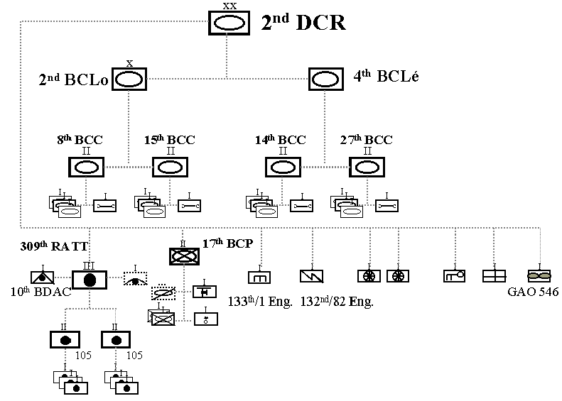 [53] Azione della cavalleria modernizzata e corazzata, classico supporto di fanteria della BCC , ruolo di contrattacco del DCR e “azione complessiva” volta a far agire insieme un DLM , un DCR e un DIM ma ancora in sospeso e di difficile attuazione a causa di questa organizzazione complessa e pesante.