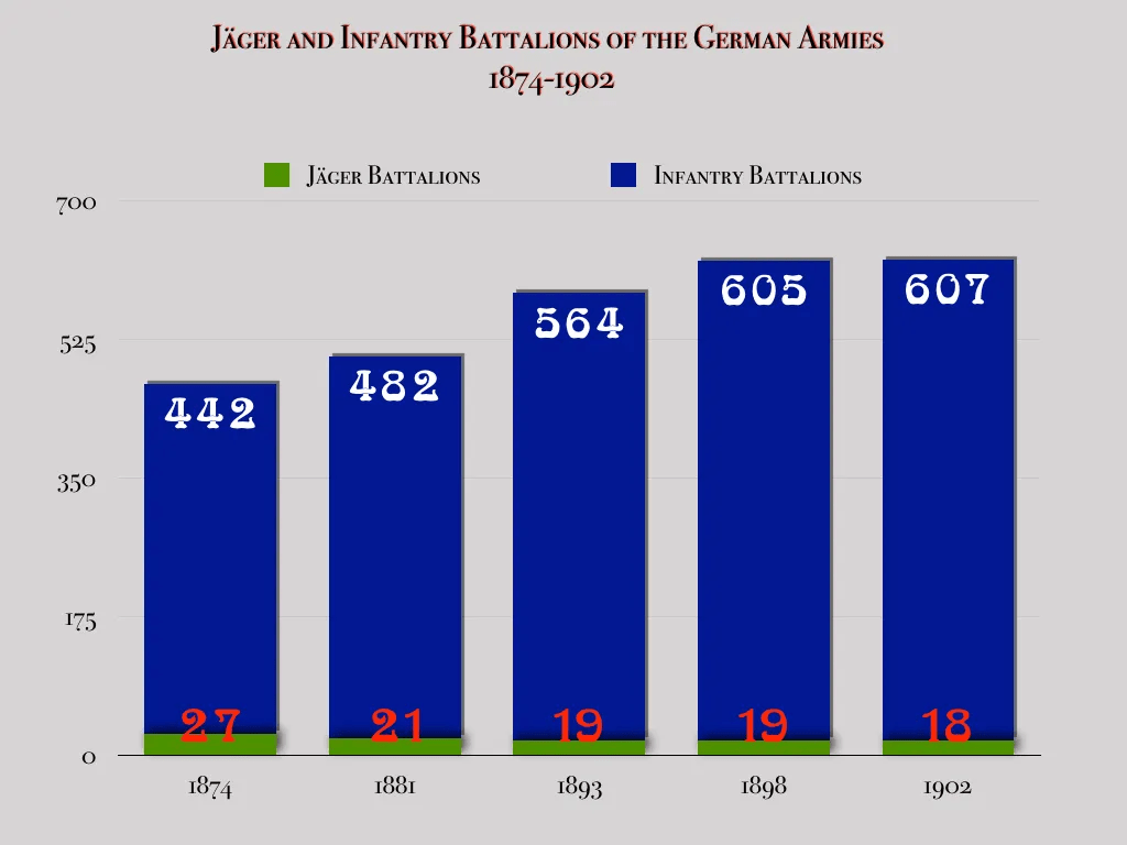Il potere posto dalle sfide all’esistenza indipendente dei battaglioni Jäger può essere visto nel destino di tali unità in Baviera e Sassonia. Nel 1878, la Baviera convertì sei dei suoi battaglioni Jäger in battaglioni di fanteria di tipo ordinario. Nel 1893, lo stesso regno trasformò altri due battaglioni Jäger in unità di fanteria di linea. Nel 1900, la Sassonia sacrificò uno dei suoi tre battaglioni Jäger per aggiungere un terzo battaglione a un reggimento di fanteria di due battaglioni.