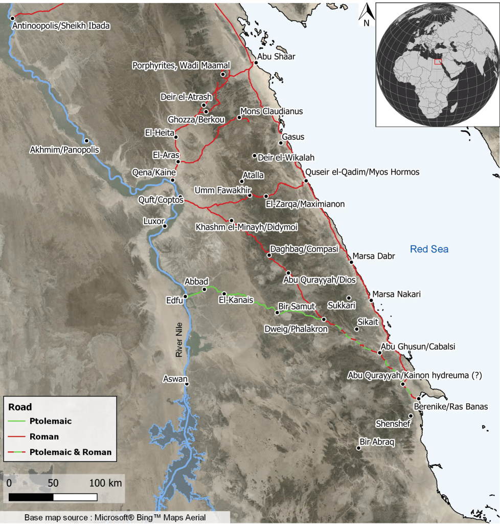 In età romana due erano i settori amministrativi e strategici della regione, l’area dominata dalle cave di Mons Claudianus e di Mons Porphyrites a nord e il deserto di Berenice a sud.