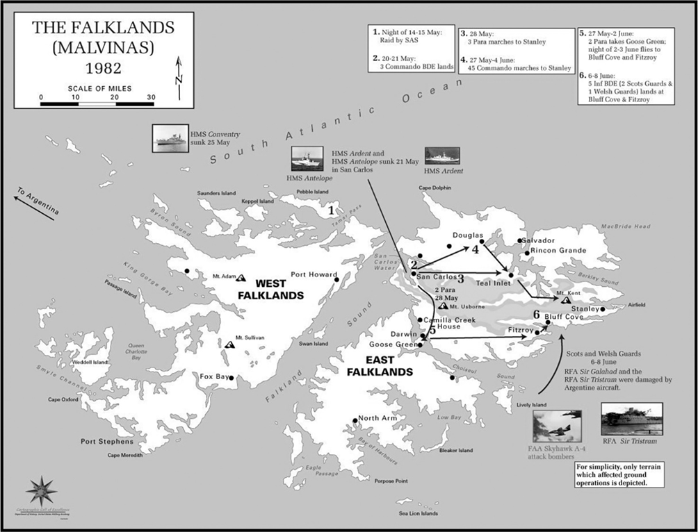 L’Argentina si trova a ovest delle isole, a circa 400 miglia nautiche dalla punta più occidentale delle isole alla costa continentale più vicina del Sud America. 43 Le Falkland sono costituite da un’area di circa 4.700 miglia quadrate. 44 Circa 2.500 miglia statutarie di costa esistono sulle isole. Le tre principali masse terrestri sono Falkland occidentali, Falkland orientali e Lafonia. Lafonia fa parte delle Falkland orientali ma è collegata solo da una stretta striscia di terra a Goose Green e Darwin. Le Falkland occidentali sono separate dalle altre dal Falkland Sound. La larghezza del suono si estende da 15 a 30 miglia tra i due gruppi di isole. Centinaia di isole più piccole si formano attorno alle tre più grandi. Le isole sono semi-montuose, che vanno dal livello del mare al punto più alto di 2.312 piedi. 45 Il terreno su tutte le isole ha molte basse colline, grandi affioramenti rocciosi e molte aree di torbiera. 46 Le isole sono prive di vegetazione, e non offrono riparo a veicoli o soldati a piedi. 47 La costa possiede decine di porti e insenature. I difensori argentini stimarono che 30 delle spiagge delle isole fossero adatte per uno sbarco anfibio. 48