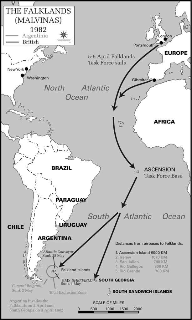 La guerra delle Falkland iniziò il 2 aprile 1982 con l’invasione argentina dei territori britannici nell’Atlantico meridionale e durò fino al 14 giugno dello stesso anno. Operation Corporate era il nome in codice di tutte le operazioni militari britanniche nella guerra delle Falkland. Strategicamente, riconquistare le Falkland fu una grande operazione anfibia, sebbene dipendesse interamente dalla capacità della Royal Navy britannica di ottenere e mantenere il controllo del mare. Il viaggio dal Regno Unito alle Falkland era di oltre 8.000 miglia nautiche. Inoltre, le Falkland distano più di 3.000 miglia nautiche dalla base britannica più vicina ad Ascension Island. Oltre a ciò, la task force dovette affrontare sfide derivanti dalle risorse tecnologiche disponibili all’epoca e dal tempo stesso, poiché l’emisfero australe si stava avvicinando presto all’inverno.