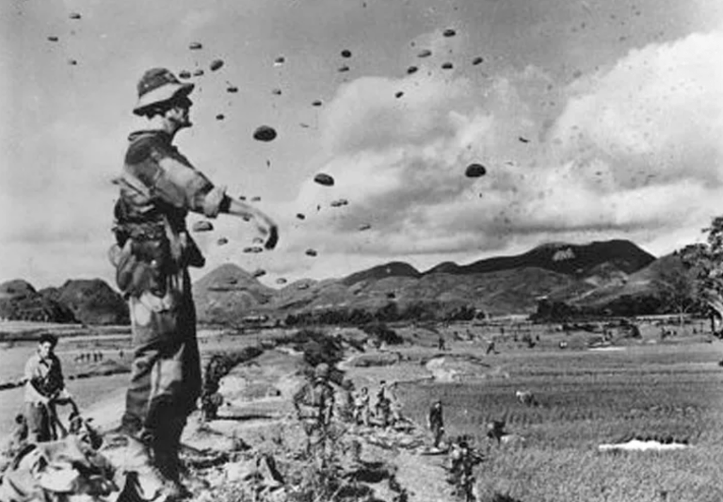 On the morning of 20 November 1953, more than one thousand French paratroopers wearing American-supplied parachutes flung themselves out of their American-supplied aircraft into the sky above Dien Bien Phu. Thousands more would follow in the next few days. Because Dien Bien Phu was so remote, it could only be supplied by air and so the first priority of the French (after securing the area) was to build a serviceable airstrip. For the next few months, the aerial resupply pipeline was reinforced with dozens of American civilian pilots (hired by the CIA) flying hundreds of flights in American supplied C-119 “Flying Boxcar” aircraft to Dien Bien Phu. One historian cites this factor as one of the primary reasons why Dien Bien Phu survived as long as it did.[3]