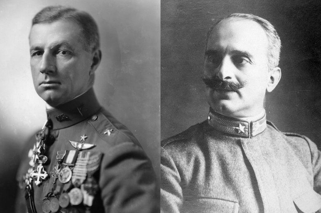 Level bombing is the tactical approach that is most familiar to the general public. It is difficult to watch a World War II documentary or newsreel without seeing an image of a large formation of B-17 or B-24 bombers with hundreds of bombs rippling from their open bomb bays. Level bombing executed by heavy bombers was the primary focus of interwar aerial theorists like the U.S. Army’s most vocal air warfare proponent, William “Billy” Mitchell (pictured below on the left) and Italian aerial warfare theorist and author Giulio Douhet (right).
