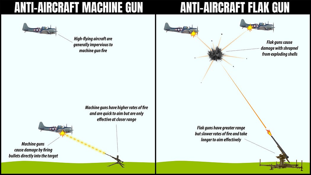 Flak guns fire a much larger projectile and can engage at greater range and altitude. However, by necessity the larger the projectile and greater the range, the slower the rate of fire. As already mentioned, high rates of fire are necessary to increase the probability of a hit since the chances of an individual projectile striking a moving aircraft are slim. Thus, if flak guns have a slower rate of fire, how can they hope to hit anything?