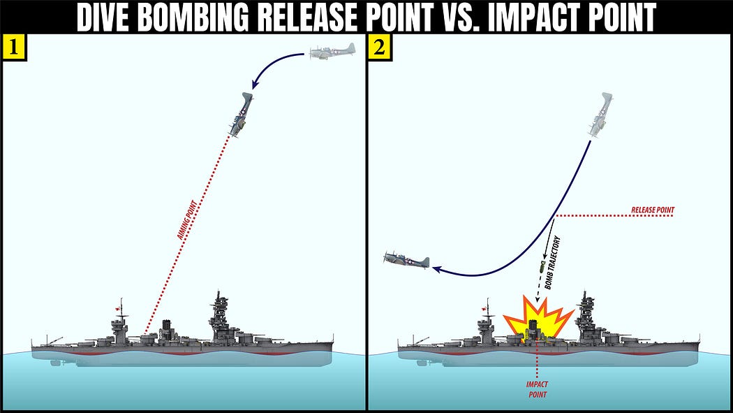 Luckily for the U.S. Navy, level bombing was not the only tactical approach available at the start of World War II. Dive bombing called for smaller, more maneuverable aircraft, carrying a lighter bomb load (usually a single bomb) to dive on a target ship and release the bomb at close range. In an era before precision-guided munitions (PGMs), dive bombing was the most accurate way to deliver bombs on target. Why was it easier to hit a small, moving target with a single bomb dropped from a single dive bomber, than it was to hit the same target with multiple salvos of bombs dropped from a formation of level bombers? The main answer lay in the simplified physics of the targeting calculation and the proximity to the target at the release point.