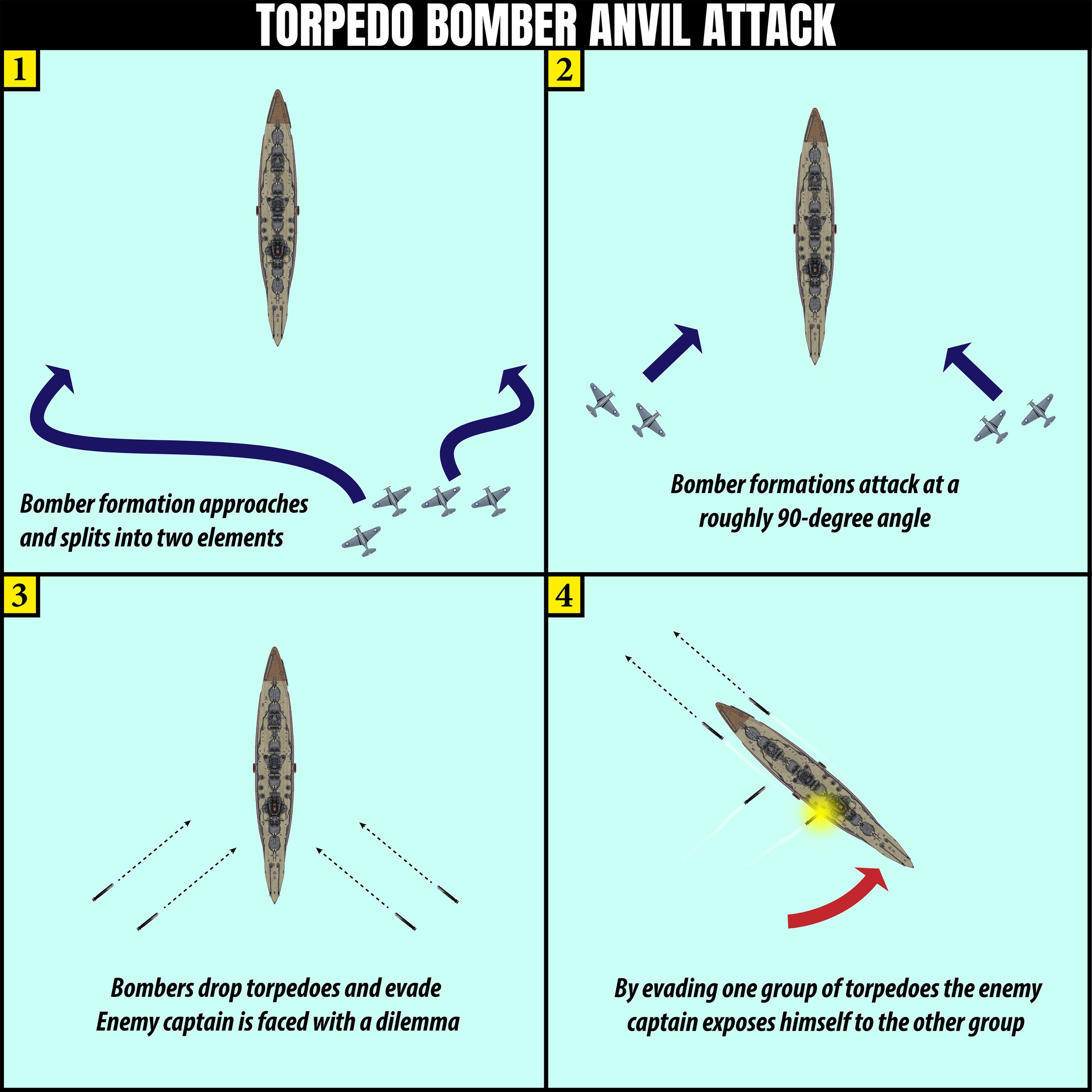 Before explaining how dive bombers, torpedo bombers and fighters work in coordination, it is best to first examine each type of aircraft and their respective tactics and attack profiles. As we will see, two key concepts apply to both the tactics of individual aircraft types and the integration of all three types. These concepts are simultaneity and survivability. To explain these concepts, we will begin by examining a common torpedo bombing technique: the anvil attack.