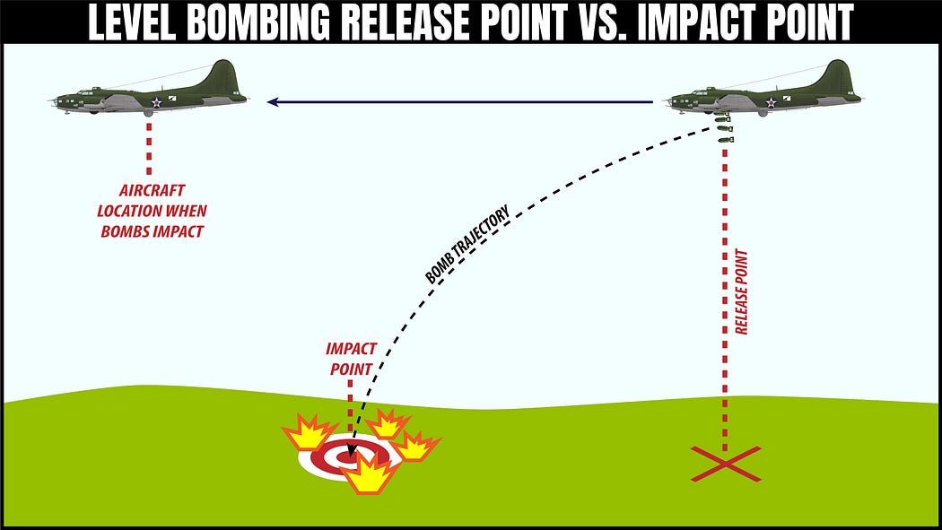 Many factors complicate the equations for accurate level bombing. To offer a general summary for people without mathematical or physics backgrounds, the first complication is that once dropped, the bombs do not travel at constant speed but rather begin to decelerate because of wind resistance. The deceleration is also not constant and is affected by the bomb’s time of flight (a function of the bomber’s initial release altitude), wind speed, wind direction and other atmospheric conditions. Wind speed and direction can also cause significant lateral drift as the bombs fall.