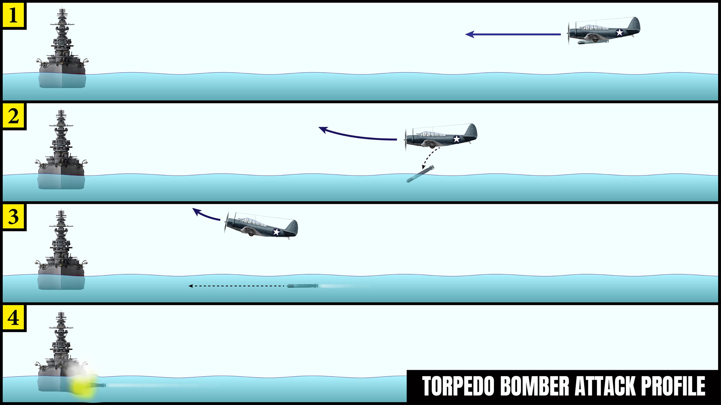 A torpedo bomber attacks a ship by flying towards the target and then dropping a torpedo into the water. Once hitting the water, the torpedo will activate and begin to run in roughly the same direction it was pointing when it was dropped. Ideally, the torpedo will continue to run until it collides with the target ship, striking the hull below the waterline. The damage caused by a torpedo is often more catastrophic than a bomb strike since the water surrounding the ships hull can compound the effects of the explosion and worsen the effects of damage, flooding the ship more quickly.