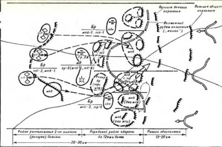 The first echelon brigades are located in the forward defense area with a depth of up to 12 km or more. The total depth of defense of a mechanized division, without taking into account the security zone, can reach 20-30 km.