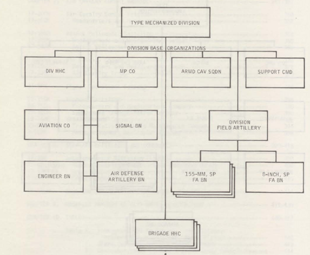 Organizationally, the division includes three brigade headquarters, six motorized infantry and four tank battalions, three 155-mm howitzer divisions, a 203.2-mm howitzer division, an Honest John anti-aircraft missile division (in accordance with the rearmament plan, it can be replaced by a Lance anti-aircraft missile division), a mixed anti-aircraft division of Chaparral SAMs and Vulcan anti-aircraft guns, three separate battalions (reconnaissance, communications, and engineer), three separate companies (headquarters, army aviation, and military police), as well as a rear command consisting of three battalions (transport and supply, medical, repair) and three companies (headquarters, adjutant general, and financial).