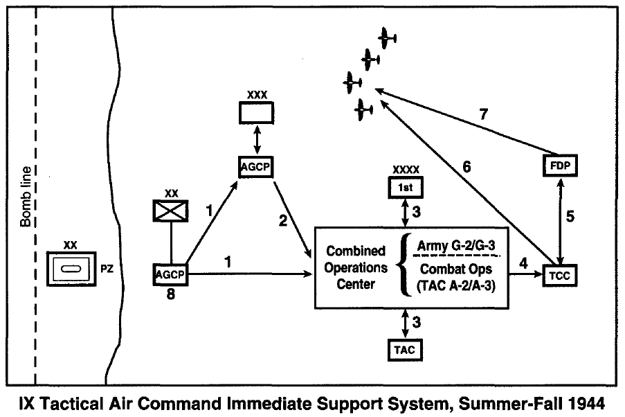 Originally developed for air defense purposes, this radar network now took on added importance for the control of tactical air strikes. For example, when an Air-Ground Coordination Party sent in a request for immediate air support, that request went directly to a Combined Operations Center functioning between the TAC and the Army. There, the Army S2 and G-3 and the TAC A-2 and A-3 evaluated the request. Assuming it was considered legitimate, the Army G-3 and Air A-3 would each approve it, and the Air A-3 would relay it to the Tactical Control Center with a recommended course of action. Typically, the TCC would relay the request to airborne fighter-bombers, and a geographically appropriate Forward Director Post would furnish precise radar guidance and navigation information from the MEW and SCR-584 radars to the strike flight, vectoring them to the target area. Once in the target area, of course, the strike flight leader would communicate with the Air-Ground Coordination Party that had sent in the request for final details. For its part, the Air-Ground Coordination Party would arrange for artillery to mark the target with colored smoke and also, if possible, to undertake suppressive artillery fire against known enemy antiaircraft defenses. Radar was also used for so-called blind bombing in conditions of reduced visibility. SCR-584 control eventually enabled blind bombing strikes with accuracies on the order of 400-yards from the predetermined aiming point, notably during the Battle of the Bulge in winter 1944-45.