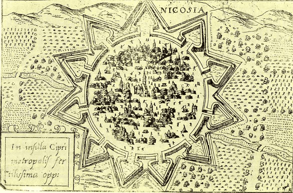 3. Nell’agosto del 1567, a Nicosia era giunto Giulio Savorgnano, sovrintendente delle artiglierie e delle fortezze dello stato veneziano. Dopo aver abbattuto la vecchie mura, costruì una nuova fortificazione alla moderna, ristretta alla città e formata da un endecagono regolare a 11 baluardi. In B. SERENO, Commentari della guerra di Cipro della lega dei principi cristiani contro il turco, 1845 (anno della prima pubblicazione a stampa di un manoscritto trovato presso l’Archivio Cassinese), leggiamo però che le fortificazioni non furono completate: