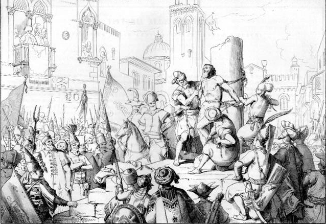 Trascinato poi sulla trireme di Rapamato, fu legato a una tavola e tirato su, per umiliarlo e insultarlo, fino alla cima di un albero. Mentre lo innalzavano, Rapamato diceva: