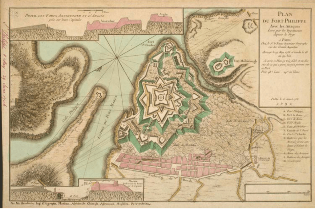 (This map depicts French siege plans for Fort St. Philips, Minorca, 8 May-29 June 1756 at Port Mahon during the Seven Years’ War. Etching and engraving; printed on paper; hand-coloured | Scale: 1:2,950 approx. Royal Collection Trust #RCIN 731075. https://militarymaps.rct.uk/the-seven-years-war-1756-63/st-philips-1756-plan-du-fort-philippe-avec-les).