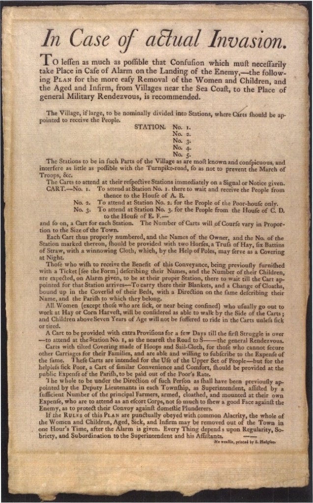 The last of this selection of broadsheets is famous because it gives instructions to the local population as to how to react in case of a real invasion, Newcastle [c.1803] (Private Collection) as follows:“In Case of actual Invasion.To lessen as much as possible that confusion which must necessarily take place in case of alarm on the landing of the enemy, – the following PLAN for the more easy removal of the women and children, and the aged and infirm, from villages near the sea coast, to the place of general military rendezvous, is recommended.