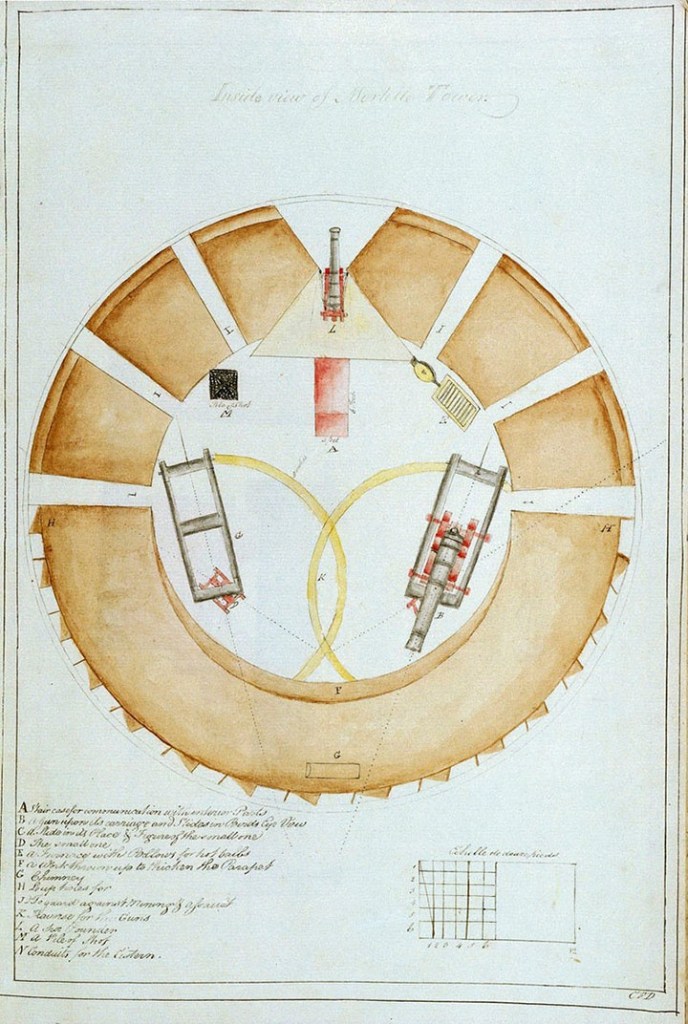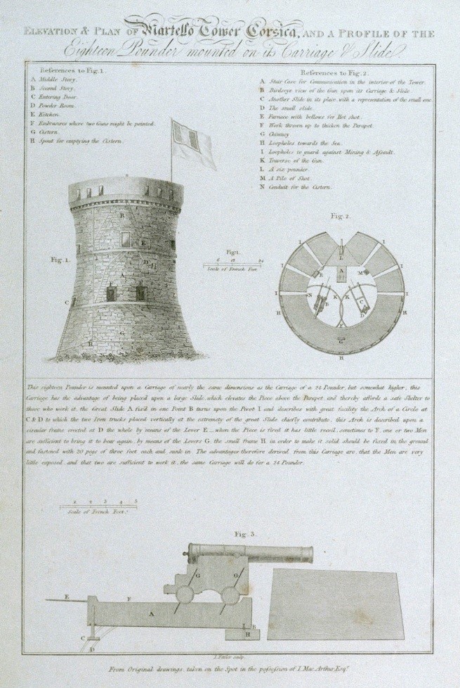 (Elevation & Plan of a Martello Tower, Corsica, and a profile of an eighteen pounder […]. From original drawings taken on the spot in the possession of I. MacArthur Esq.r., PAD1624, Royal Museum, Greenwich, UK.)