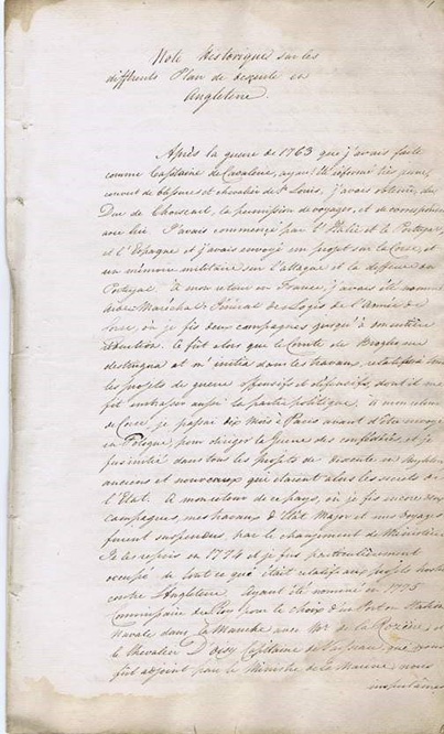 (« Mémoire militaire sur l’Angleterre » ; manuscrit de 113 pages folio. Papier filigrane de 1799. Cette page : « Note historique sur les différents plan [sic] de descente en Angleterre »)