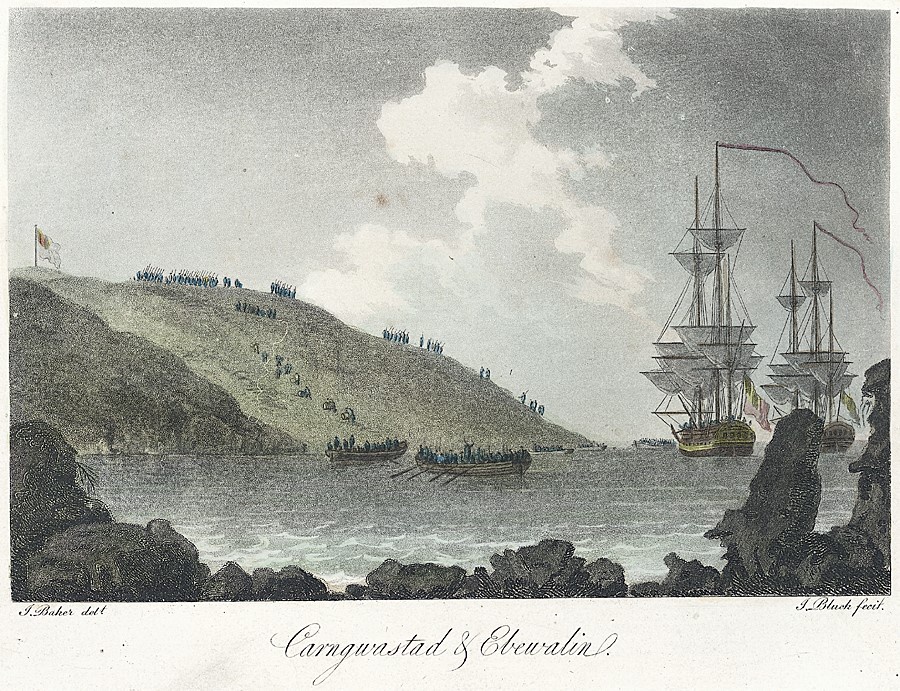 (James Baker, J. Bluck, Carngwasted & Ebewalin, [after Feb. 1797], engraving [5] – French troops landing from their anchored vessels and setting up on Welsh soil.)