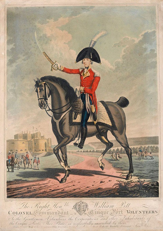 (William Pitt the Younger became Lord Warden of the Cinque Ports in August 1792, but while serving as prime minister played little role in their defence. However, after his resignation in 1801 he took on a more active role. In 1802 he formed the three battalion-strong Cinque Port Volunteers who were responsible for the defence of Hastings, New Romney, Hythe, Dover and Sandwich, along with the two ‘Antient Towns’ of Winchelsea and Rye. Until his return to office in May 1804 Pitt often drilled his men in person in his capacity as Colonel Commandant.)