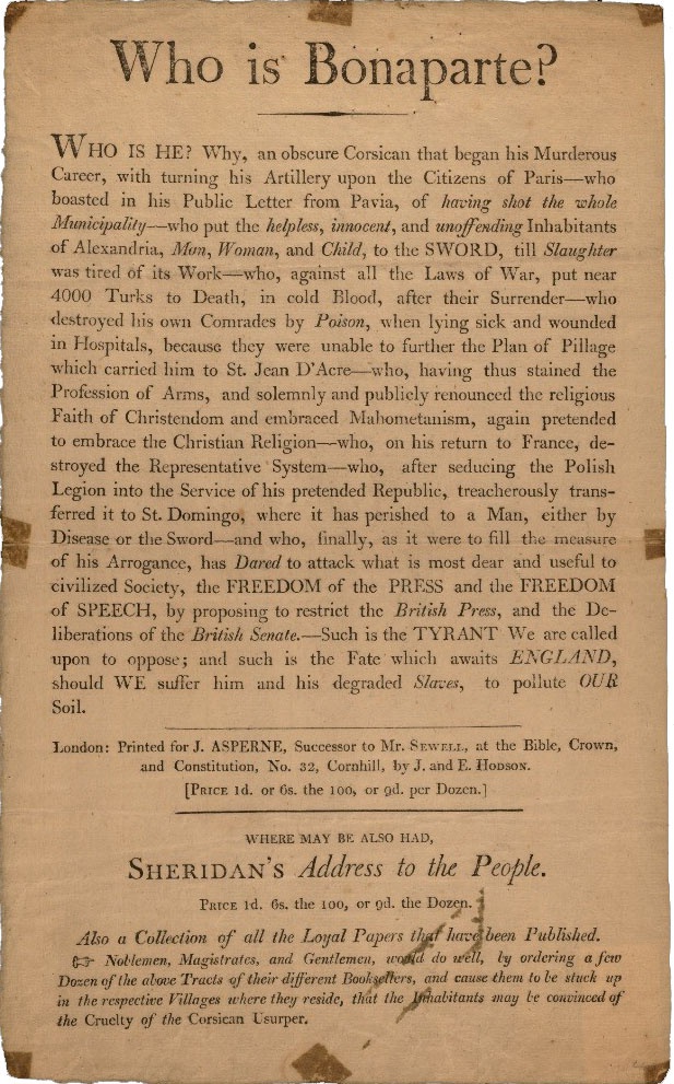 (A footnote exhorts « Noblemen, Magistrates and Gentlemen » to order several dozen copies of the poster from their local bookseller and to have them posted in the villages where they live so as to inform the people of “the cruelty of the Corsican Usurper”.)