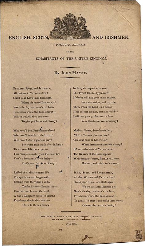 (Patriotic poster addressed to the inhabitants of the United Kingdom (English, Scots and Irishmen, but not Welsh), July 1803 (Private Collection)