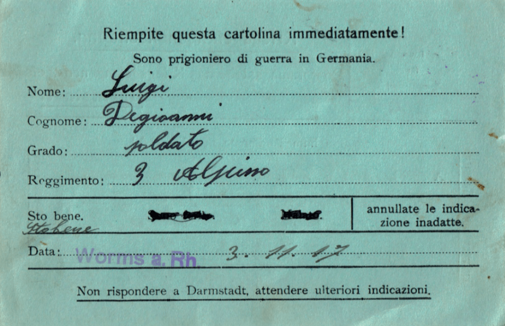 Prendiamo il caso di Pantaleo Casazza, caduto prigioniero il 20 ottobre 1917 e morto in Germania il 23 febbraio 1918. L’unica testimonianza dell’intero periodo di detenzione è una missiva del 28 gennaio 1918 in cui il soldato dichiara di trovarsi prigioniero e di stare bene: questo è tutto ciò che rimane della parte finale della sua esistenza.(18)