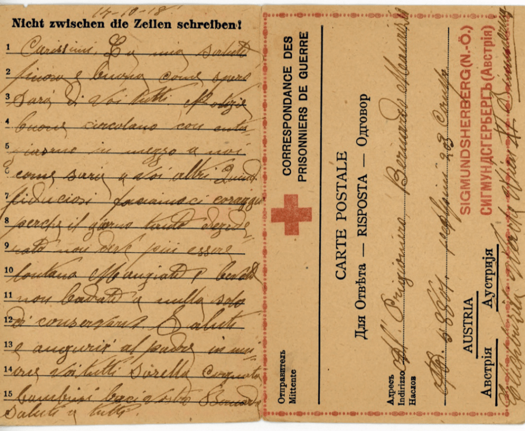 La prima tipologia per estensione è senz’altro la cartolina in franchigia, fornita direttamente dai nemici per il tramite della Croce Rossa Internazionale, la quale aveva anche il compito di provvedere alla consegna dei pacchi. Esse assolvono alla funzione <zero> della comunicazione prigioniero-casa, ovvero il contatto. È infatti una cartolina in franchigia ad informare i parenti del soldato circa la sua nuova condizione di recluso e il suo stato di salute. Generalmente i prigionieri avevano a disposizione una cartolina in franchigia a settimana per poter contattare i propri familiari. Si tratta di una tipologia di scrittura rigidamente controllata dalla censura, costretta nello spazio testuale –massimo 15 righe– e votata ad una comunicazione basilare, quasi sempre incentrata sulla richiesta di cibo e sulla rassicurazione circa il proprio stato di salute. Una delle versioni di cartolina in franchigia più diffuse prevedeva persino una risposta già pagata per i familiari, i quali erano dunque costretti a comunicare con le stesse modalità sorvegliate e contingentate dei detenuti. Di qui l’importanza della lettera, intesa come maggiore spazio di espressione e profondità dei concetti.