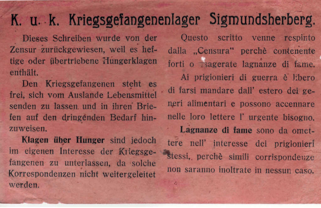 (Figura 3. Avviso di censura della posta militare di Sigmundsherberg dove si spiega il motivo per cui la corrispondenza è stata rigettata. Ai prigionieri sono proibite «forti o esagerate lagnanze di fame». Fonte: ALSP, Grande Guerra, GG25, Epistolario Bernardo Maurizio, Avviso di censura.)