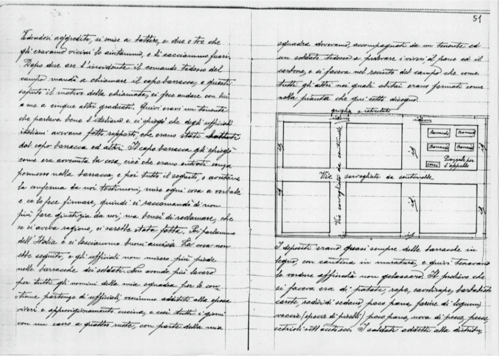 (Figura 4. Particolare della memoria di prigionia di Alessandro Mezzano con pianta ortogonale del campo di concentramento. Fonte: ALSP, Grande Guerra, GG17, Memoria Mezzano, pp. 50-51.)