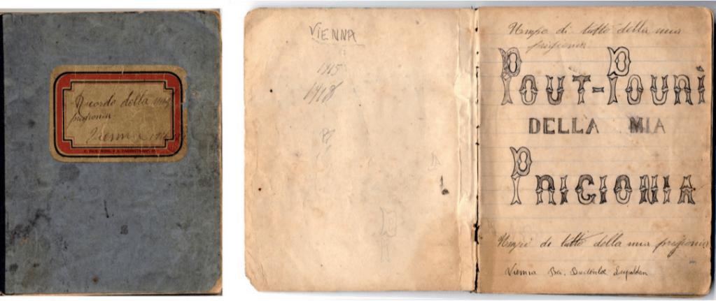 (Figura 6. Sinistra: Copertina del diario-memoria di Mario Cassini. Titolo autografo: «Ricordo della mia prigionia. Vienna 1916-17». Fonte: ALSP, Grande Guerra, GGDig, Diario Cassini, copertina. Destra: Frontespizio del diario-memoria di Mario Cassini. Titolo autografo «Pout-Pourì della mia Prigionia – Unpò di tutto della mia prigionia». Fonte: ALSP, Grande Guerra, GGDig, Diario Cassini, p. 1.)