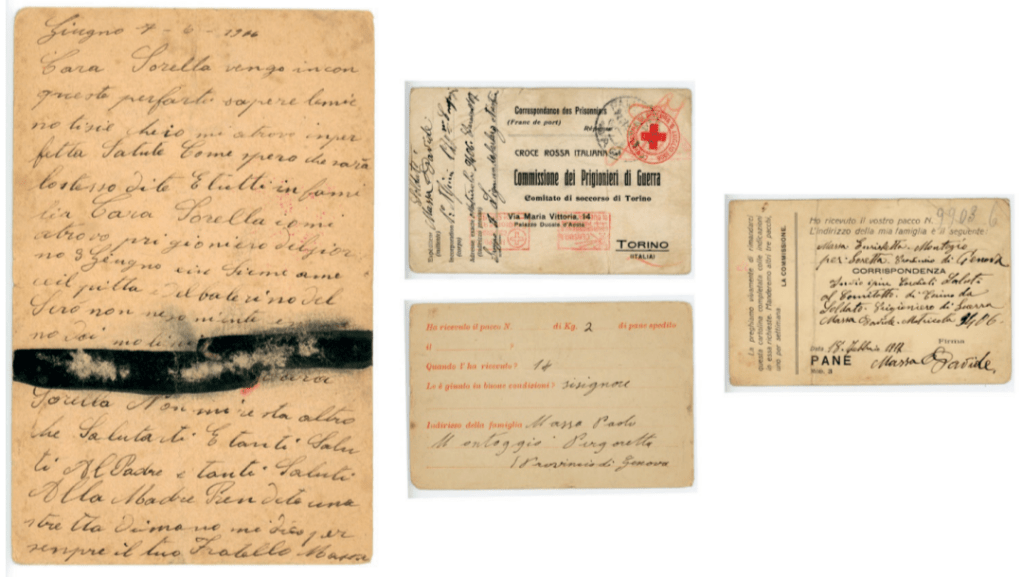 (Figura 8. Sinistra: Cartolina in franchigia per prigionieri di guerra senza linee prestampate. Nel particolare si noti una frase censurata. Fonte: ALSP, Grande Guerra, GG44, Epistolario Massa, Cartolina in franchigia, 7 giugno 1916. Centro superiore: Esempio di cartolina in franchigia (recto) per prigionieri di guerra a cura del Comitato di soccorso di Torino. Questo tipo di oggetto postale era correlato all’abbonamento per l’invio di pacchi postali contenenti pane. Si noti, tra gli altri, il bollo rosso della «Convenzione di Ginevra 6 luglio 1906». Fonte: ALSP, Grande Guerra, GG44, Epistolario Massa, Cartolina in franchigia, 18 febbraio 1917. Destra: Ricevuta di consegna dei pacchi alimentari (recto) con questionario per il prigioniero. Si noti la risposta autografa «sisignore» relativa alle buone condizioni del plico. Fonte: ALSP, Grande Guerra, GG44, Epistolario Massa, Ricevuta pacchi, 14 ottobre 1917. Centro inferiore: Verso della cartolina in franchigia con stampigliate le indicazioni del mittente sul numero di pacco ricevuto e lo spazio per eventuali comunicazioni aggiuntive. Si noti inoltre l’indicazione: «La preghiamo vivamente di rimandarci questa cartolina completata colle indicazioni in essa richieste. Manderemo altri tre pacchi, uno per settimana. La Commissione». Fonte: ALSP, Grande Guerra, GG44, Epistolario Massa, Cartolina in franchigia, 18 febbraio 1917).