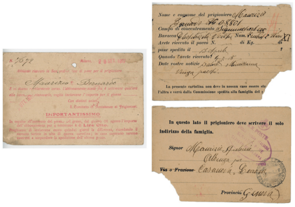 (Figura 9. Sinistra: Abbonamento alla Croce Rossa Italiana per l’invio di pacchi alimentari (pane) al prigioniero Maurizio Bernardo. Fonte: ALSP, Grande Guerra, GG25, Epistolario Bernardo Maurizio, 20 settembre 1917. Destra superiore: Cartolina in franchigia che attesta la consegna dei pacchi alimentari (verso) con questionario per il prigioniero. Si noti la nota autografa «Salute ottimissima. Venga pacchi». Fonte: ALSP, Grande Guerra, GG25, Epistolario Bernardo Maurizio, data illeggibile. Destra inferiore: Cartolina in franchigia che attesta la consegna dei pacchi alimentari (recto) con indirizzo del destinatario. Fonte: ALSP, Grande Guerra, GG25, Epistolario Bernardo Maurizio, data illeggibile.)