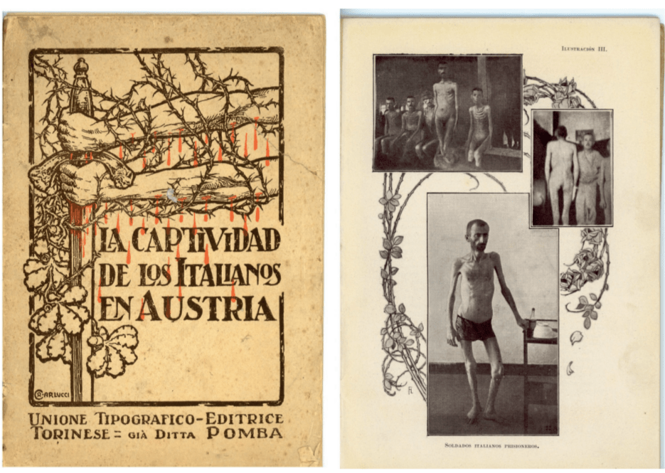 (Figura 10. Sinistra: Copertina di un libro di denuncia sul trattamento dei prigionieri italiani in Austria. Tradotto in varie lingue, si propone qui la versione in spagnolo. Fonte: (1918), La captividad de los italiano en Austria. Impresiones y recuerdos, Unione Tipografico-Editrice Torinese, Torino. Destra: Particolare del libro: le fotografie mostrano le condizioni deplorevoli dei prigionieri italiani al momento della liberazione. Fonte: (1918), La captividad de los italiano en Austria. Impresiones y recuerdos, Unione Tipografico-Editrice Torinese, Torino, p. 15.)